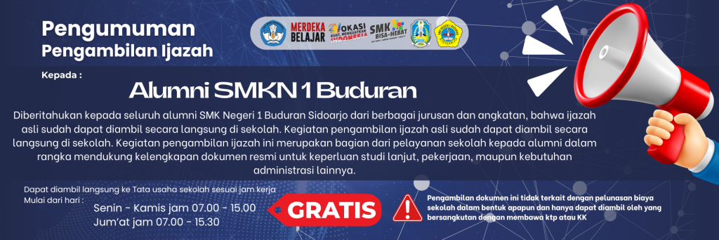 Semoga dengan adanya website ini dapat membantu dan bermanfaat, terutama informasi yang berhubungan dengan pendidikan, ilmu pengetahuan dan informasi seputar SMK Negeri 1 Buduran
