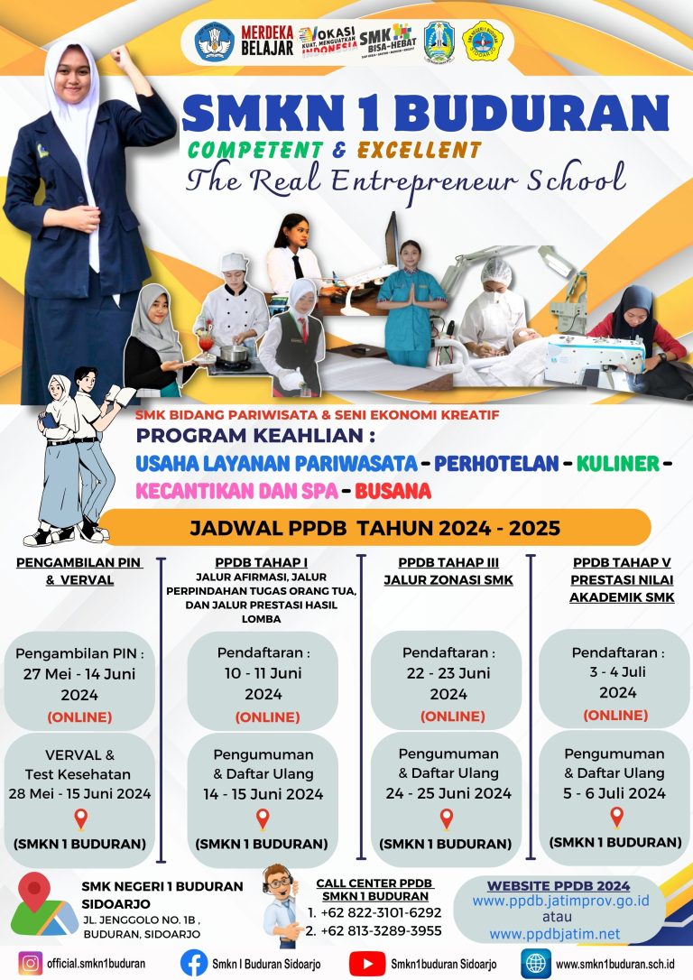 Buduran, 12 Desember 2025 — SMKN 1 Buduran menggelar kegiatan Bunka Shoukai dengan tema “Kankouchi” (Destinasi Wisata Jepang) di Hall Edotel. Kegiatan ini dipimpin oleh Arif Purnawan, S.ST.Par dan Erlina Dwi Kuspujiyanthi, S.Pd., serta diikuti oleh sekitar 90 siswa dari…