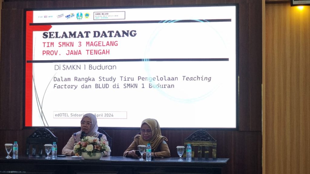Sidoarjo, Senin, 29 April 2024 bertempat di Hall Edotel SMKN 1 Buduran menerima kunjungan studi tiru dari SMKN 3 Magelang Jawa tengah,. Kunjungan tersebut disambut oleh Ibu Dra. Agustina, M.Pd selaku Kepala sekolah beserta bapak ibu Wakil kepala Sekolah, Seluruh Kepala Program Keahlian ,Tim Teaching Factory dan Tim BLUD SMKN 1 Buduran.